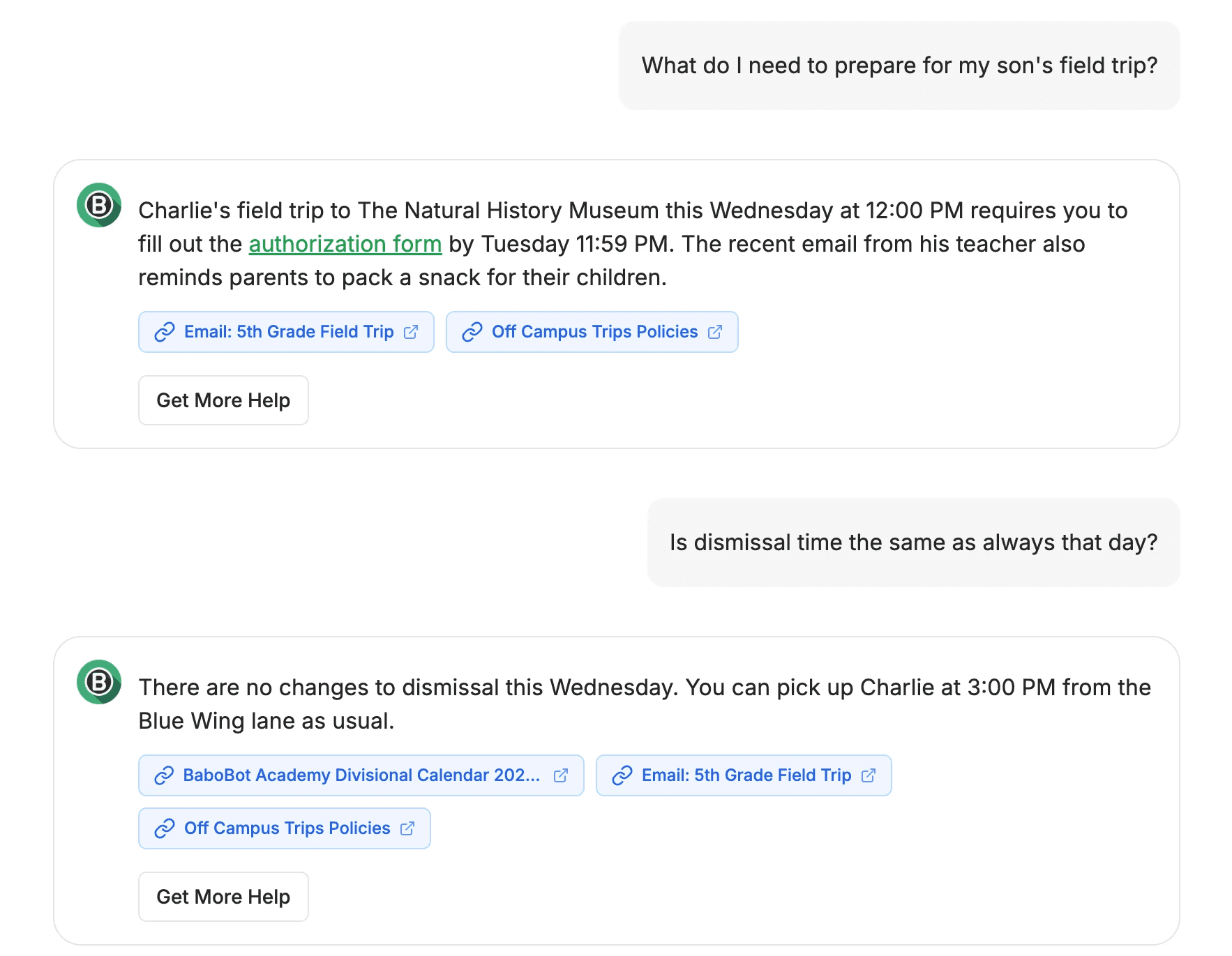 BaboBot only responds using content your school has uploaded and approved, including handbooks, calendars, policies, announcements, and other authorized documents. It never generates information on its own or search the web.